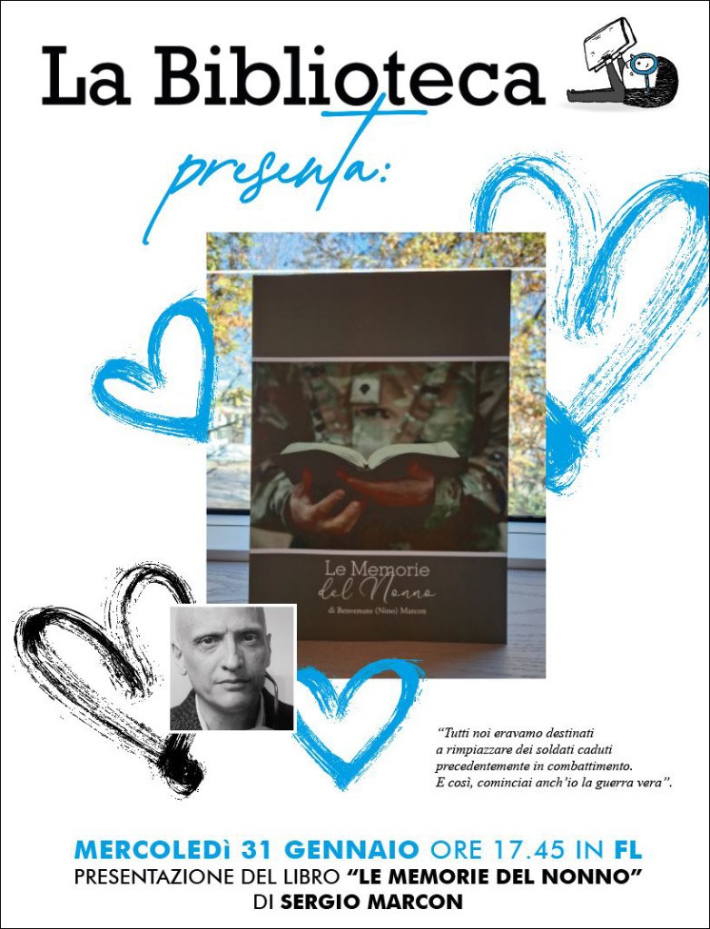 Insomma e in sintesi, mercoledì 31 gennaio ho fatto da moderatrice a Sergio Marcon, co-autore della biografia “Le Memorie del Nonno” di Benvenuto (Nino) Marcon, di fronte ad un attentissimo ed emozionato pubblico di colleghi e famigliari, in Ferramenta Livenza.